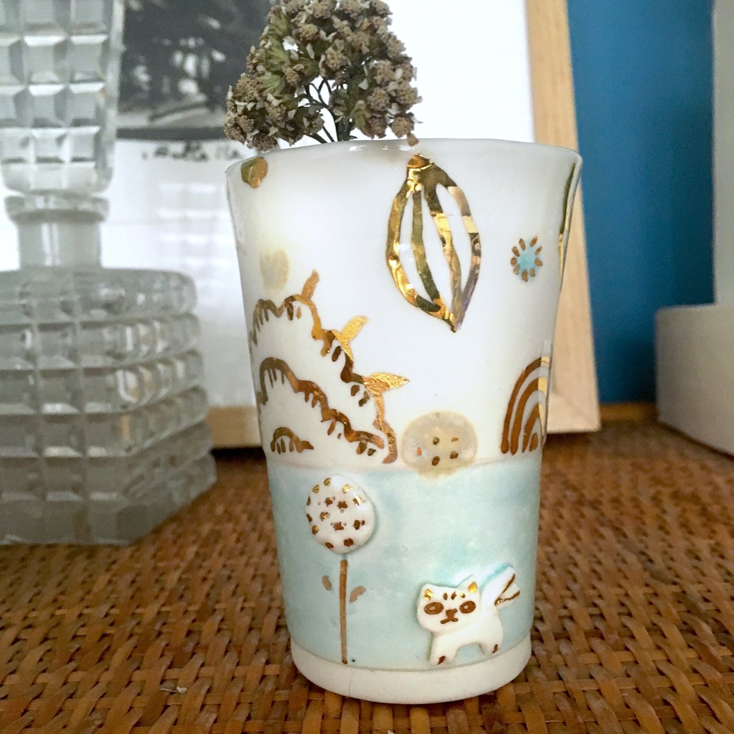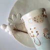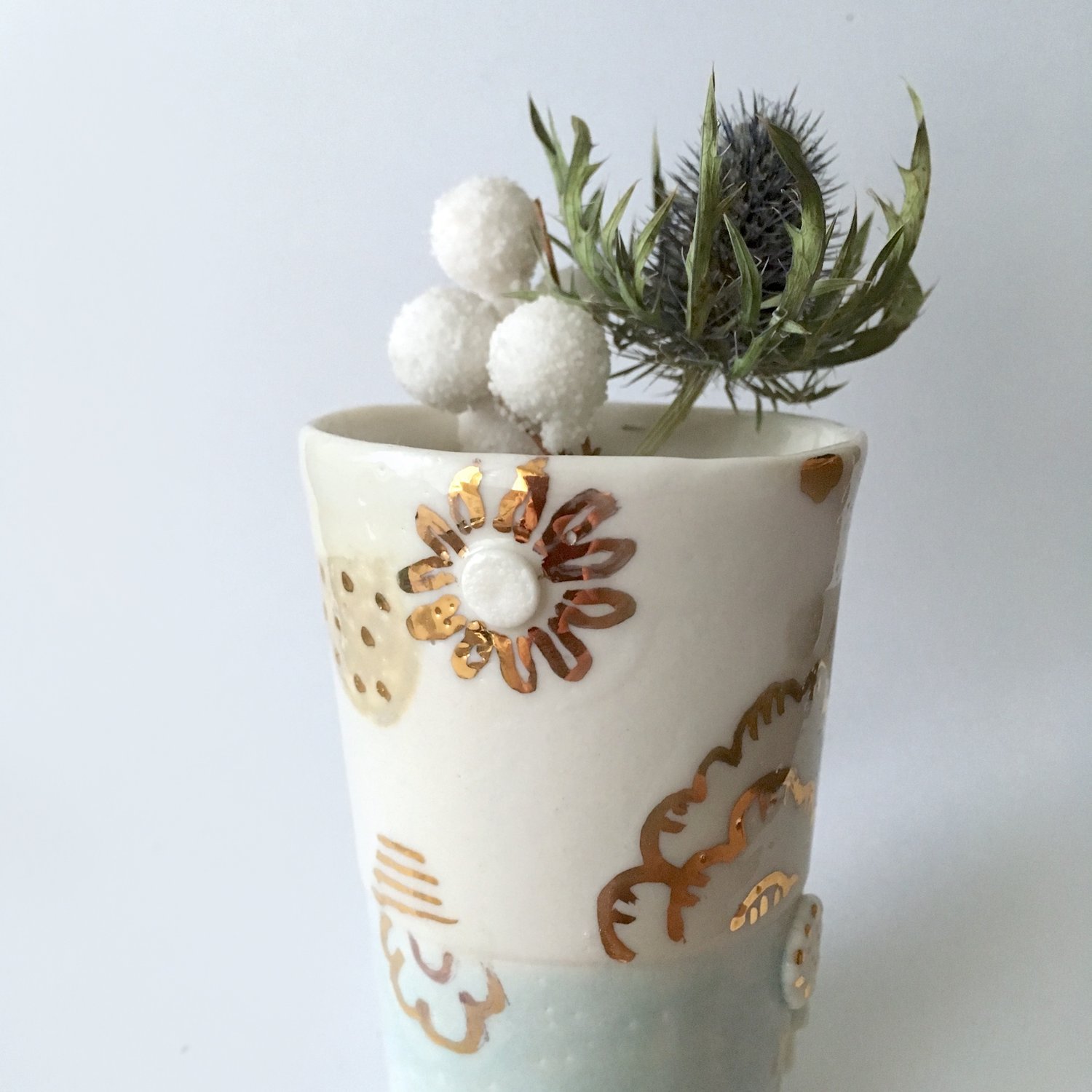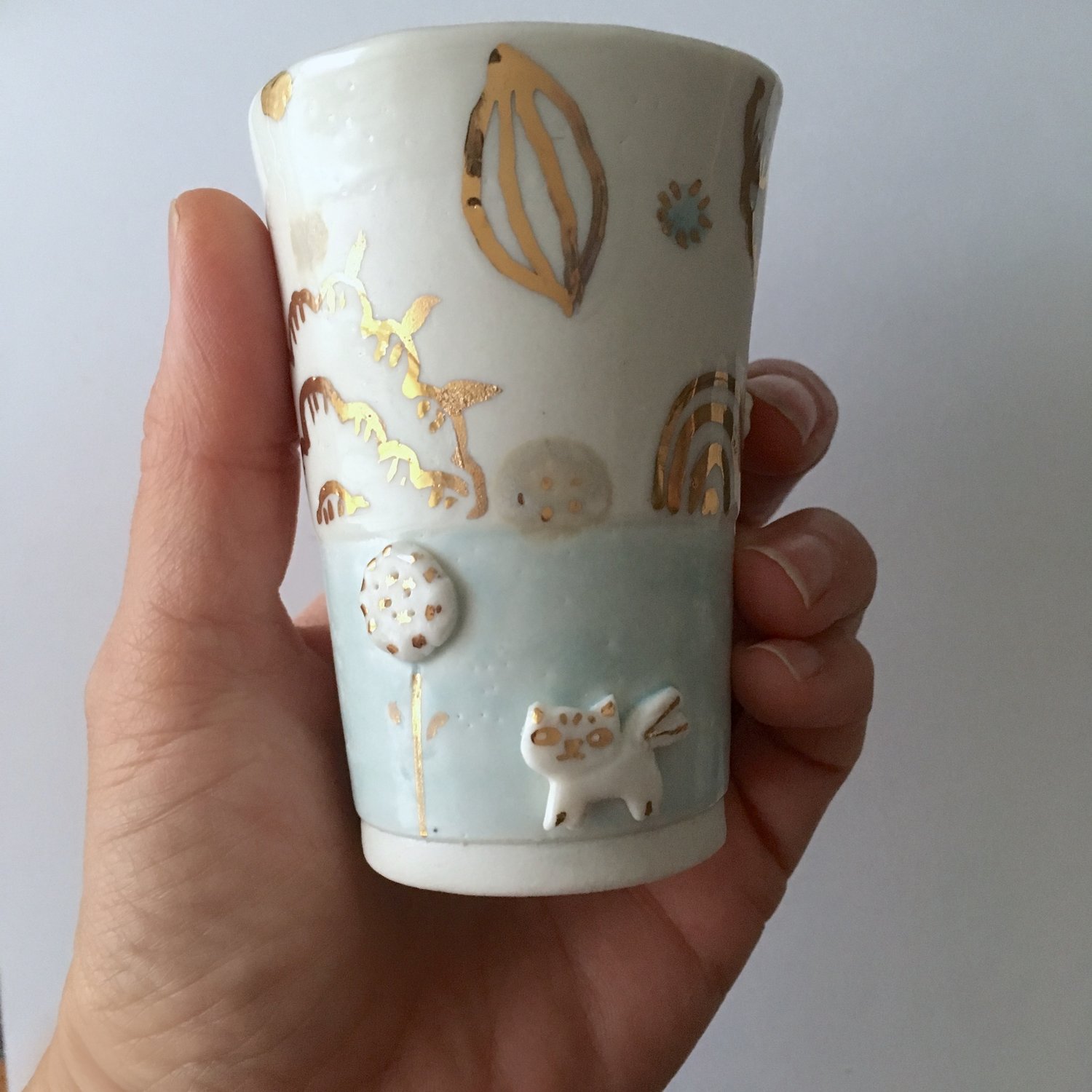 The cup is made of porcelain by casting than tiny modeled pieces are added, glazed with food safe glaze, and then illustrated with gold using a tiny brush.